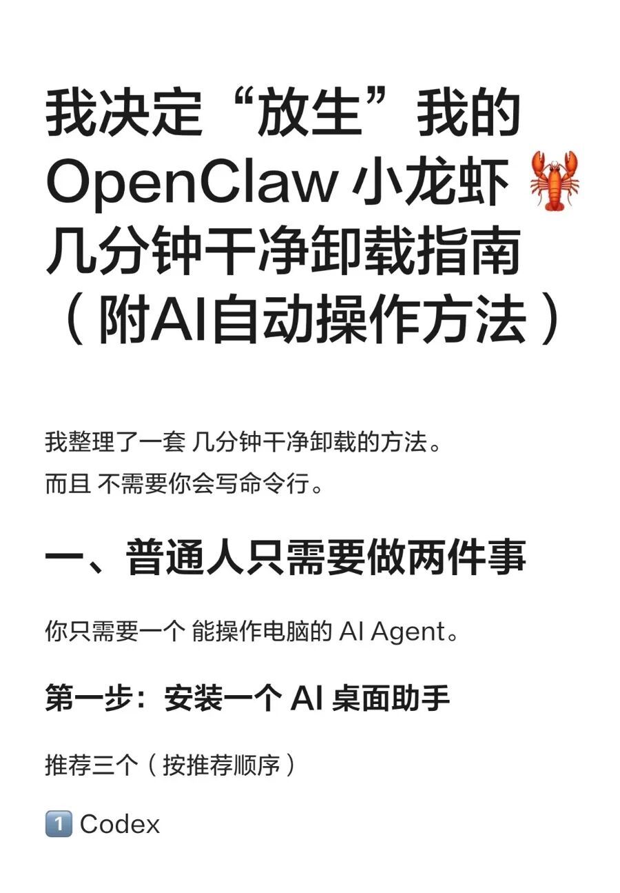 王劲发布了一条如何“安全、彻底卸载龙虾详细步骤”的帖子。但王劲也知道,这份卸载攻略,短期内都不会获得太多关注和追捧,因为对于任何AI工具而言,风险和危害真正暴露,或许也需要几周乃至几个月的时间。