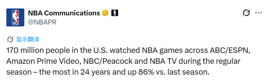 全美NBA赛事总观看时长超9.2亿小时,环比上涨25%,同样刷新2011–12赛季后最高纪录;
